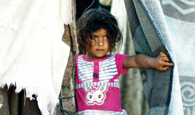 شقاء أ. ف. بطفلة فلسطينية تطل من خيمتها المتهالكة التي تؤويها وعائلتها في مخيم النصيرات للاجئين وسط قطاع غزة، حيث يعاني الفلسطينيون أوضاعا معيشية مأساوية نتيجة الفقر المدقع والحصار الاسرائيلي المفروض على القطاع منذ أعوام.