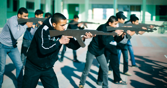 تدريبات رويترزطلاب فلسطينيون يتدربون على حمل السلاح في أحد مدارس مدينة خانيونس الثانوية جنوب غزة، وذلك ضمن برنامج تديره «حماس» لتأسيس أول مدرسة عسكرية فلسطينية مهمتها خلق جيل كامل قادر على مقاومة الاحتلال.