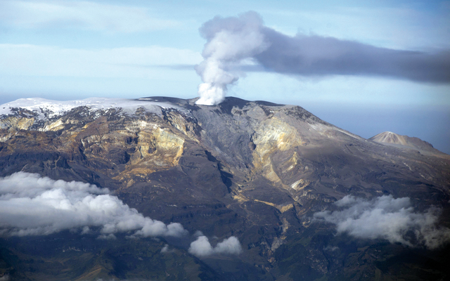 ثوران أ ف بلقطة جوية لبركان نيفادو ديل رويز في كولومبيا، ينفث حممه في ثوران كانت حذرت منه السلطات منذ فبراير الماضي، فيما تجري الاستعدادات لحملة إجلاء كبرى تقارب 5.3 كيلومترات في جميع الاتجاهات من هذا البركان الثائر