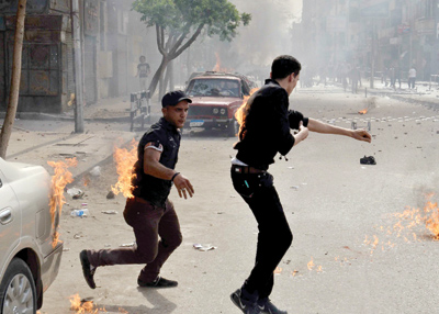 مصريان يحاولان إطفاء النيران المشتعلة بملابسهما خلال صدامات أمام كنيسة العباسية أودت بشخصين وجرح نحو 90 استمراراً للوضع الطائفي المحتقن أ.ف.ب