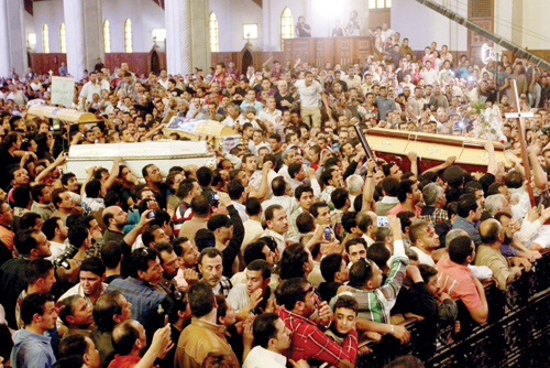 آلاف الأقباط يُشيّعون قتلى الأحداث الطائفية التي داهمت مدينة الخصوص في محافظة القليوبية، حيث وقعت صدامات أسقطت جرحى خلال التشييع إي.بي.ايه