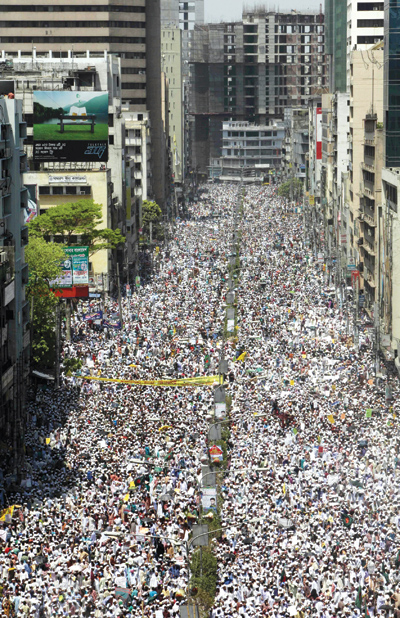 خرج عشرات آلاف الإسلاميين إلى شوارع العاصمة البنغلاديشية دكا يوم السبت الماضي للمطالبة بإعدام مدونين بعد كتابات لهم اعتبرت مسيئة للإسلام.