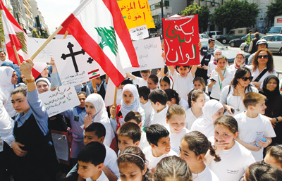 طلبة لبنانيون، مسلمون ومسيحيون، يحملون لافتات تنادي بالوحدة الوطنية خلال تظاهرة في العاصمة بيروت بالتزامن مع الذكرى الـ38 لاشتعال الحرب الأهلية التي انتهت بعد 15 عاماً باتفاق الطائف مخلفةً 200 ألف قتيل.