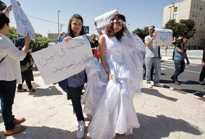 ناشطون فلسطينييون من الأراضي المحتلة عام 1948 ومدينة القدس يحتجون كلٌ على طريقته أمس باعتصام ضد الفصل العنصري أمام مكتب رئيس حكومة الإحتلال بنيامين نتانياهو، بالتزامن مع تمديد قانون رفض لم الشمل بين فلسطينيي الـ48 والضفة الغربية. وكان الاعتصام ضمن حملة «حب في زمن الأبارتهايد» على شكل عرس رمزي، شاركت فيه عروس فلسطينية من أراضي الـ48 وغاب فيه عريس فلسطيني من الضفة، وذلك بمشاركة ناشطين ومحامين ونواب عرب في الكنيست. اي.بي.ايه