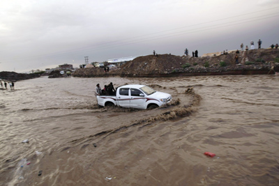 سيارة يمنية وسط الأمطار الغزيرة في العاصمة صنعاء. أ.ب