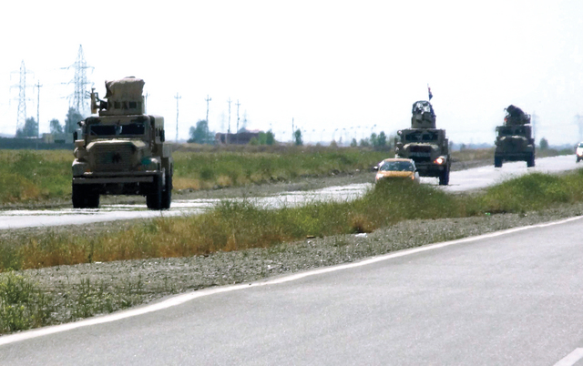 انتشار مقلق أ ف بعربات مدرّعة ومؤلّلة تابعة للجيش العراقي في طريقها بعيداً عن نقاط التماس مع كركوك التي انتشرت فيها يوم السبت وحدات من البيشمركة الكردية رفعت درجة القلق الحكومية العراقية