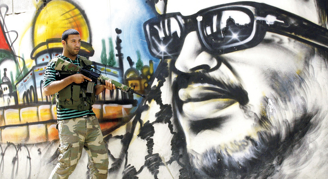 توتر أ.ف.بمسلّح من حركة فتح يسير بجانب صورة للزعيم الراحل ياسر عرفات (أبو عمّار) في مخيم عين الحلوة الفلسطيني، القريب من صيدا، جنوبي لبنان، حيث خلفت اشتباكات اندلعت الليلة قبل الماضية بين عناصر من «فتح» ومتشددين، سقوط قتيل وإصابة العشرات.