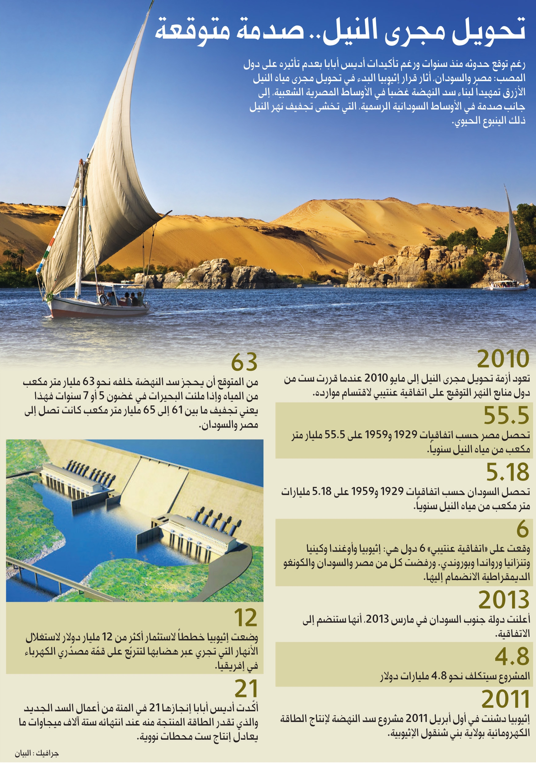 وبدأت إثيوبيا تحويل مجرى نهر النيل الأزرق لبناء سد مهم لتوليد الطاقة على ما أعلن مسؤولون إثيوبيون أمس، إذ قال الناطق باسم شركة الكهرباء الوطنية الإثيوبية أديس تاديلي: «لبناء السد ينبغي تجفيف مجرى النهر الطبيعي»، وذلك غداة مراسم رسمية أقيمت في موقع الأعمال.