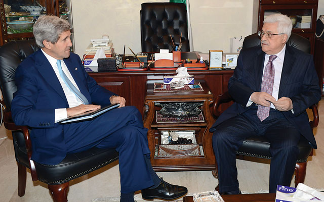 كما عقد الرئيس الفلسطيني محمود عبّاس (أبو مازن) اجتماعاً مطوّلاً مع كيري في عمّان. وقال الناطق الرسمي باسم الرئاسة الفلسطينية نبيل أبوردينة، إنّه «تمّ خلال الاجتماع مناقشة كافة القضايا التي يمكن أن تسهم في خلق المناخ المناسب للعودة للمفاوضات»، مضيفاً أنّ «عباس أكّد على ثوابت الموقف الفلسطيني والعربي المتمثل بإقامة دولة فلسطينية مستقلة وعاصمتها القدس الشريف، فيما أكد كيري التزام الرئيس الأميركي باراك أوباما بإقامة دولة فلسطينية على أساس حل الدولتين».