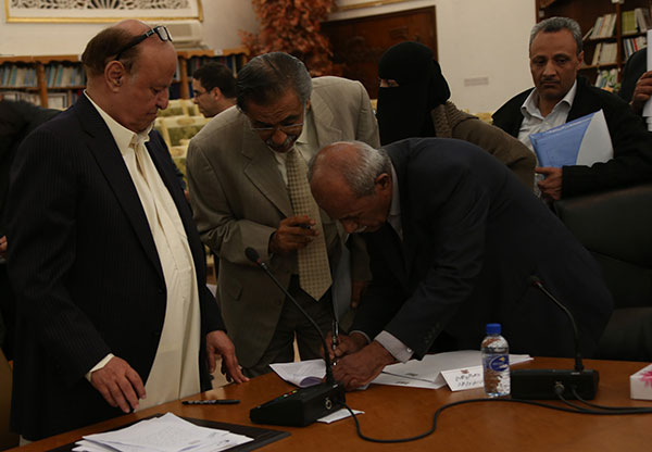 ونطلب من مجلس الأمن عبر الأمين العام دعم الجهود اليمنية لتطبيق مخرجات مؤتمر الحوار الوطني الشامل ومراقبة تقدم العملية الانتقالية، خصوصاً تطبيق هذا الاتفاق، ونطلب كذلك استمرار مساعدة الأمم المتحدة، بما فيها تنسيق جهود المجتمع الدولي، لدعم بناء دولة اليمن الاتحادية الجديدة.