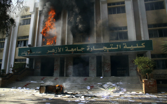 وقالت مصادر أمنية إن طلابا مناصرين لجماعة الاخوان الإرهابية "اقتحموا مبنى كلية التجارة وعطلوا سير الامتحانات ثم اشعلوا النيران فيها"، مضيفة ان النيران "اتت على طابقين من المبنى وان قوات الحماية المدنية تدخلت لإطفاء النيران".