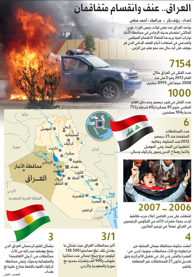 في غضون ذلك، اتهم محافظ نينوى أثيل النجيف، القائد العام للقوات المسلحة رئيس الوزراء نوري المالكي بـ«ترك محافظة الأنبار لمسلحي القاعدة».