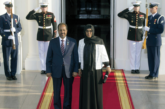 شرح الصورة: الرئيس الصومالي وزوجته لدى وصلهما إلى البيت الأبيض إي.بي.إيه