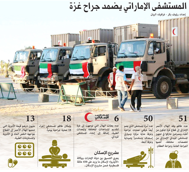 ويضيف أنه «تم التنسيق بين جمعيتي الهلال الأحمر الاماراتي والهلال الأحمر المصري لدخول قوافل الإغاثة والمستشفى الميداني عبر معبر رفح البري الواصل بين مصر وقطاع غزة».