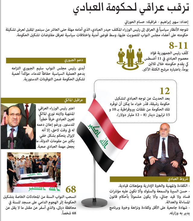 وأكد العبادي أنه يسعى إلى تشكيل حكومة تستوعب كل الطاقات وتضم كل المكونات وأن يكون الوزير عراقياً بعيداً عن مكونه وطائفته وناشد القوى السياسية توحيد خطابها السياسي في مواجهة الإرهاب.