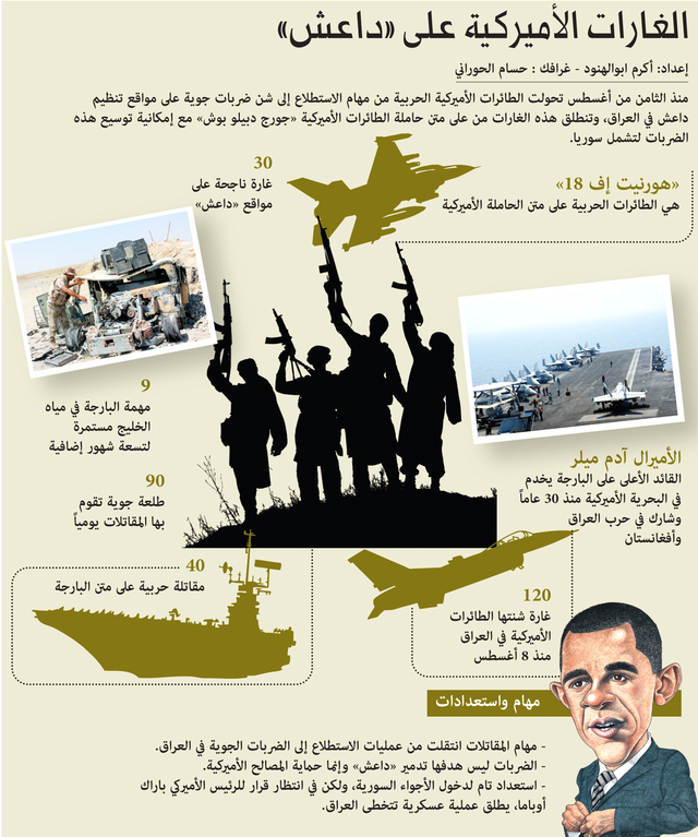 إلى ذلك، وسعت الولايات المتحدة ضرباتها الجوية في العراق؛ حيث نفذت أربع ضربات جوية على مواقع «داعش» قرب امرلي، بعد إبلاغ الرئيس الأميركي باراك أوباما الكونجرس بموافقته على ضربات جوية مستهدفة في العراق.