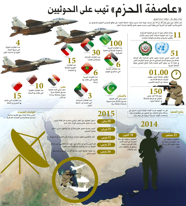 باشر تحالف عربي دولي يضم أكثر من 10 دول ضربات جوية، تحت مسمى عملية «عاصفة الحزم»، على مواقع المتمردين الحوثيين المدعومين من الخارج والذين انقلبوا على الشرعية التي يمثلها الرئيس عبدربه منصور هادي وأفشلوا مبادرات الحوار.