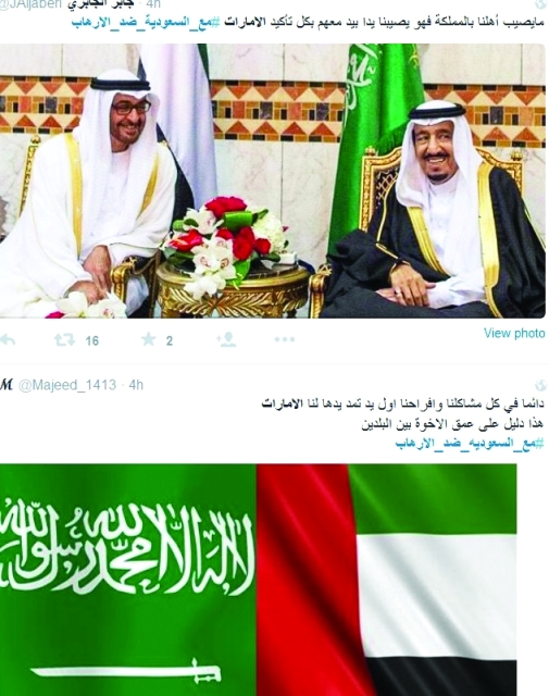 وكتب المغرد محمد الرئيسي: «دولة الإمارات العربية المتحدة والمملكة العربية السعودية هما صمام الأمان للخليج ووحدتهما هو ما يؤرق الأعداء». وكتب أحمد الحربي: «من أرض الإمارات كلنا جنود لأرض الحرمين دار سلمان الحزم حفظه الله». أما عمر الساعدي فعبر عن تضامنه مع المملكة بالقول: «من الإمارات للسعودية.. كربكم هو كربنا ومصابكم هو مصابنا».