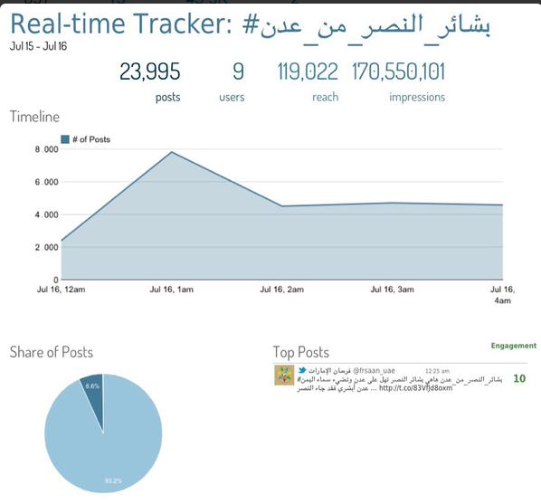 وكانت البيان قد نشرت خبر التفاعل الكبير مع الوسم #بشائر_النصر_تأتي_من_عدن في حساباتها الرسمية على تويتر وفيسبوك وخلال أقل من 7 ساعات حقق الخبر مشاهدات وتفاعلا منقطع النظير من قبل الجمهور، سواء في فيسبوك او تويتر، رغم أن الخبر نشر قبيل فجر اليوم "الخميس" بدقائق وهو وقت كما يعلم الجميع ليس للقراءة خصوصا هنا في الإمارات حيث يستغل الناس ذلك الوقت في العبادة وانتظار صلاة الفجر ومنها إلى النوم، حيث اليوم إجازة رسمية.