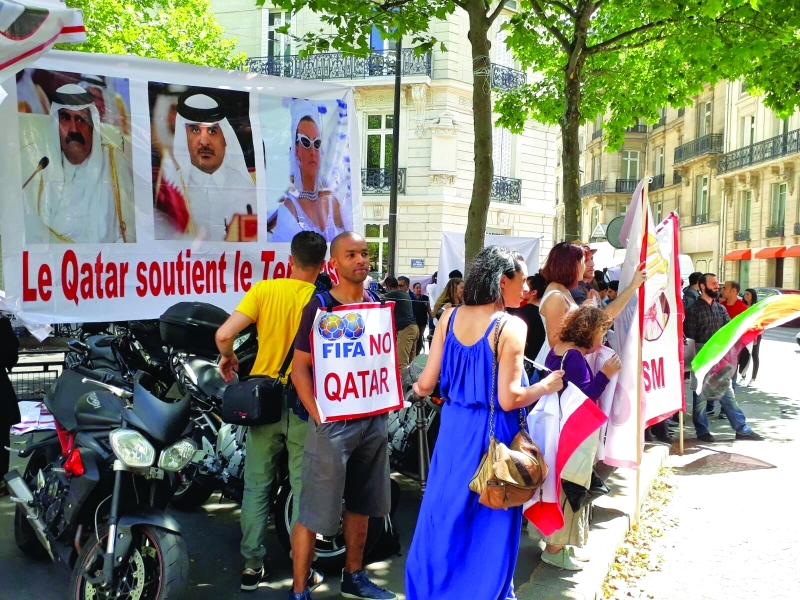 وحمل المحتجون شعارات بالفرنسية والإنجليزية تطالب الحكومة القطرية بالكف عن دعم الجماعات المتطرفة، التي وصل أذاها وإرهابها إلى عواصم غربية وباريس بالذات، التي أصابها الإرهاب عدة مرات في السنوات القليلة الماضية.