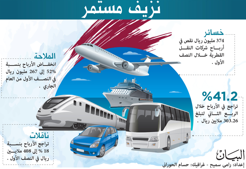 تهاوت أرباح شركات النقل القطرية المدرجة في سوق الأسهم بشكل ملحوظ في النصف الأول من العام الجاري في مؤشر على تضرر أعمالها منذ أن قررت عدة دول على رأسها الإمارات والسعودية ومصر والبحرين قطع علاقتها مع الدوحة في 5 يونيو الماضي بسبب دعمها للإرهاب.