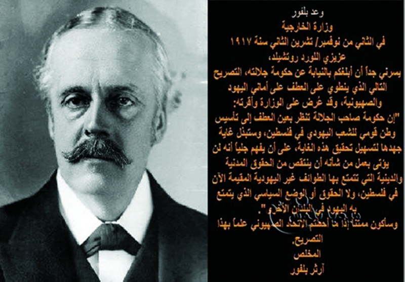 تعهد وزير خارجية بريطانيا آرثر بلفور في رسالة عام 1917 بعثها إلى اللورد البريطاني اليهودي يونيل روتشيلد، بإقامة الوطن اليهودي في فترة لم يكن اليهود في فلسطين يزيدون عن 5 في المئة. وفتح الوعد الباب لتأسيس إسرائيل على أنقاض المدن والقرى الفلسطينية المدمرة فضلاً عن تشريد شعبه بأكمله. وقد وصفه مؤرخون بأنه «وعد من لا يملك لمن لا يستحق».