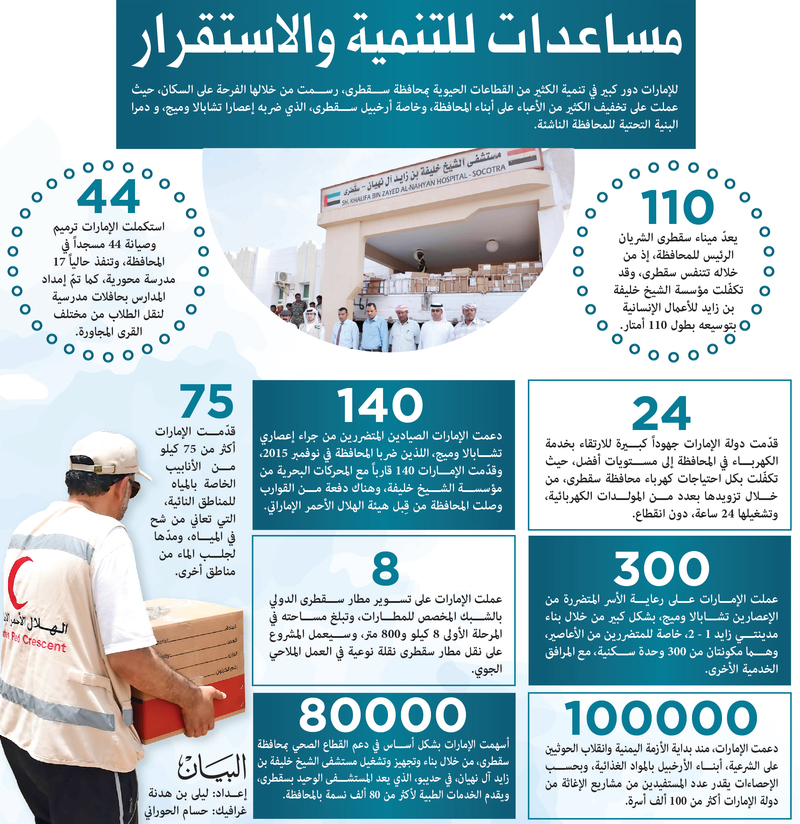 وفي شهر ديسمبر من العام 2012، كانت أولى بشائر الخير الإماراتية لأهالي محافظة أرخبيل سقطرى التي يبلغ تعداد سكانها 135 ألف نسمة، حيث شهد افتتاح المستشفى الوحيدة في الجزيرة وهو مستشفى الشيخ خليفة بن زايد، ويعالج أكثر من 95 في المئة من سكان الجزيرة، ويوجد فيه حالياً 4 تخصصات طبية، تقدم الخدمة للسكان بكفاءة عالية. والمشروع العملاق الذي تم استمرار العمل فيه ثلاث سنوات ومساحته 1470 متراً مربعاً وبكلفة تقدر بمليون و700 ألف دولار، أسهم بشكل أساسي في تحسن الوضع الصحي في كافة مناطق الجزيرة.
