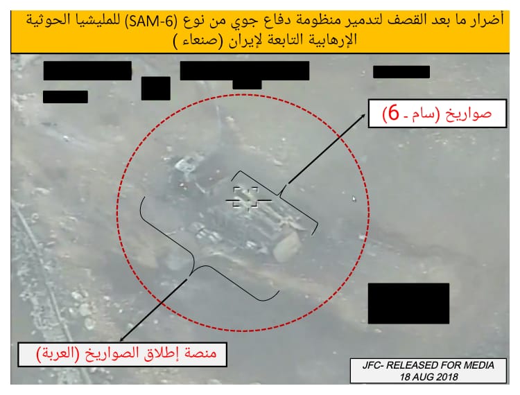 أعلن التحالف العربي استهداف منظومة دفاع جوي من نوع سام 6 تابعة للميليشيات الحوثية وتدميرها في صنعاء.