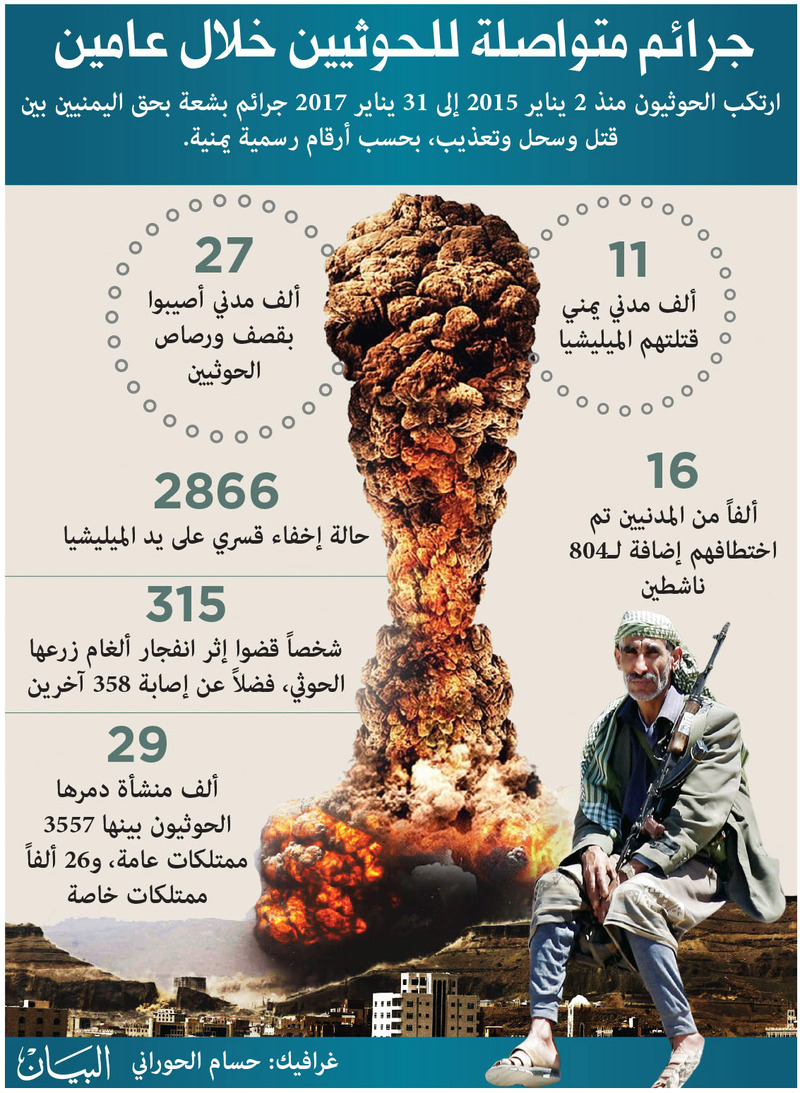 وأكدت المنظمة أنه «على السلطات الحوثية أن تفرج فورا عن المحتجزين تعسفا، وأن توقف الإخفاءات القسرية وأن تحقق جديا مع المسؤولين عن التعذيب واحتجاز الرهائن وتعاقبهم»، مذكرة بأن احتجاز رهائن يشكل «جريمة حرب».