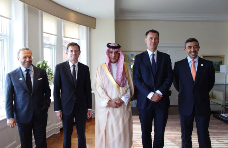 وفي تصريحات أدلى بها وزير الخارجية البريطاني جيريمي هانت، حث أعضاء مجموعة الدول الرباعية على بذل كل جهد ممكن للدفع بعملية السلام التي تقودها الأمم المتحدة في اليمن، واغتنام الفرصة لتحقيق تقدم سياسي للأزمة في اليمن. حضر اللقاء معالي الدكتور أنور بن محمد قرقاش وزير الدولة للشؤون الخارجية، ولانا زكي نسيبة المندوبة الدائمة لدولة الإمارات لدى الأمم المتحدة.