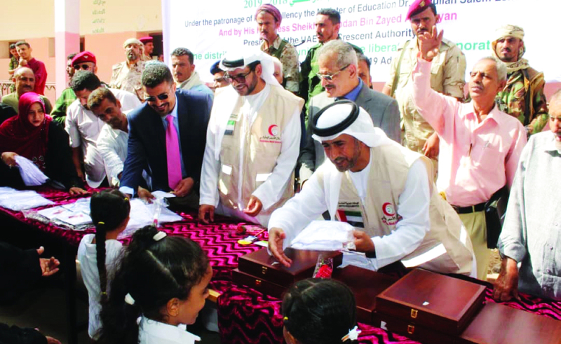 بدأت هيئة الهلال الأحمر الإماراتي توزيع الزي المدرسي على 100 ألف طالب وطالبة في خمس محافظات يمنية محررة، هي: عدن ولحج وأبين والضالع وتعز.