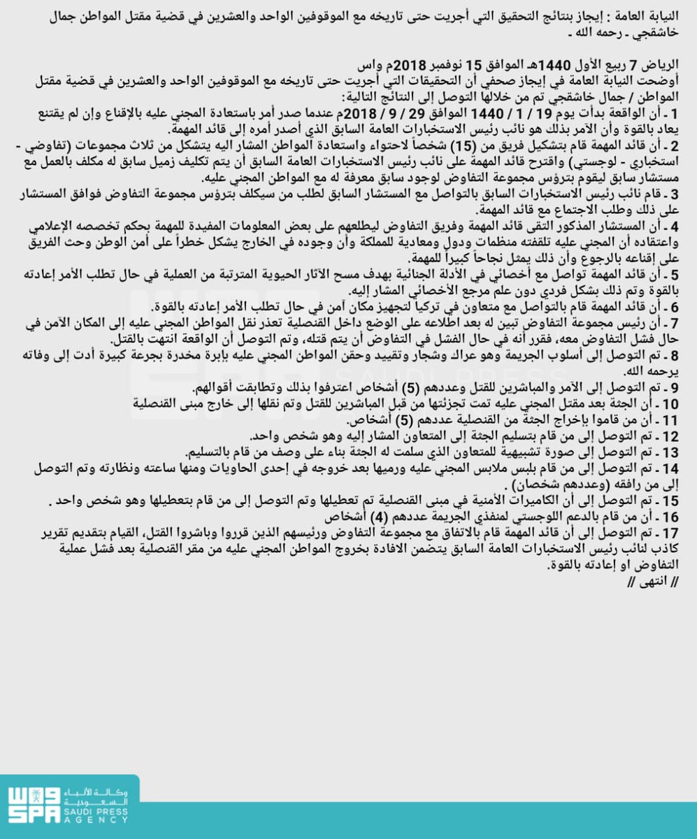 وذكرت وكالة الأنباء السعودية واس، أن النائب العام وجه التهم إلى 11 شخصا من الموقوفين في قضية مقتل جمال خاشقجي وعددهم 21 ، وإقامة الدعوى الجزائية بحقهم مع المطالبة بقتل من أمر وباشر الجريمة منهم وعددهم 5 أشخاص وإيقاع العقوبات الشرعية على البقية.