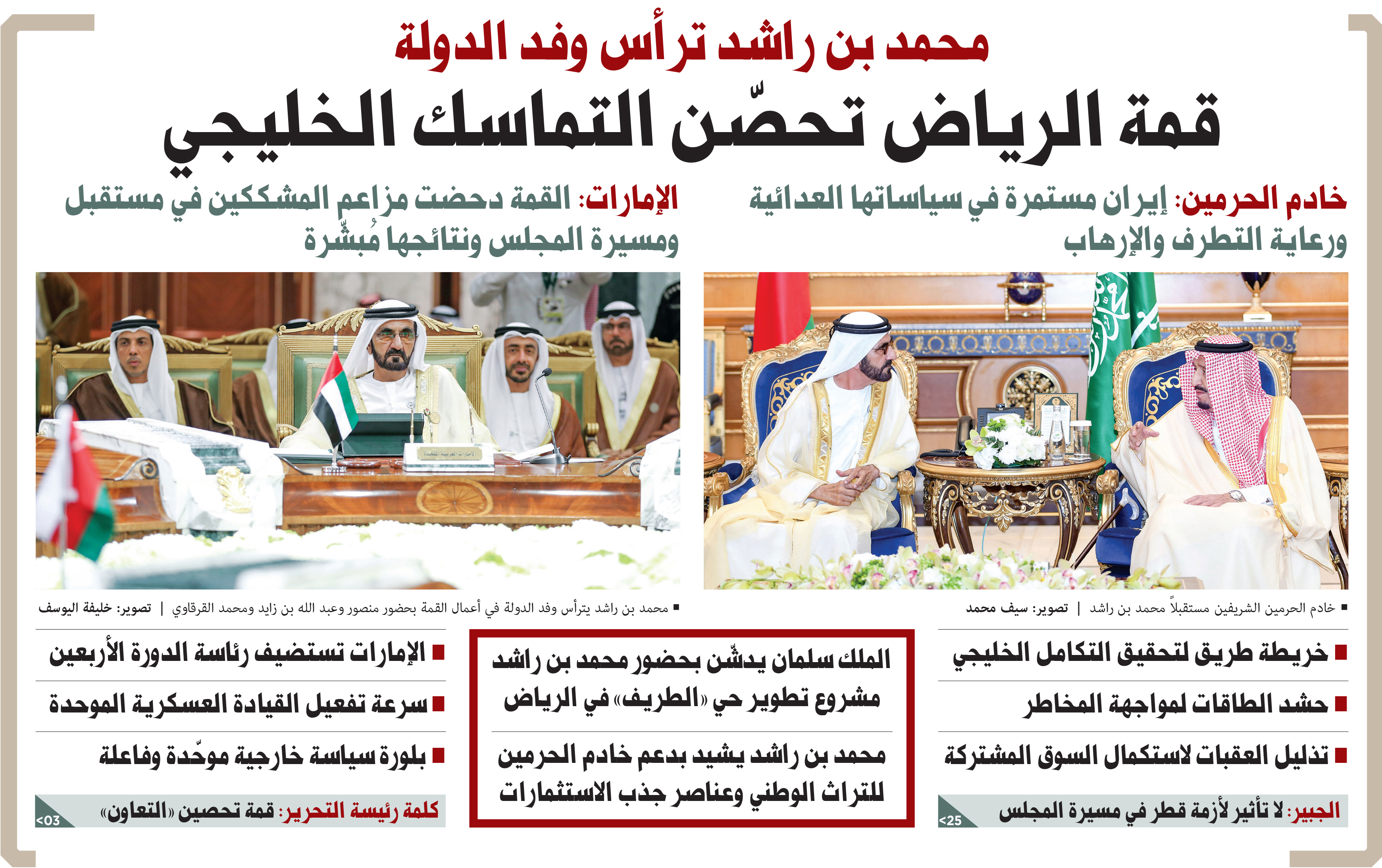 اختتم قادة دول مجلس التعاون لدول الخليج العربية قمتهم التاسعة والثلاثين التي عُقدت أمس في قصر الدرعية بالعاصمة السعودية الرياض، بحضور صاحب السمو الشيخ محمد بن راشد آل مكتوم، نائب رئيس الدولة رئيس مجلس الوزراء حاكم دبي، رعاه الله، على رأس وفد الدولة الذي ضم سمو الشيخ منصور بن زايد آل نهيان، نائب رئيس مجلس الوزراء وزير شؤون الرئاسة، وسمو الشيخ عبد الله بن زايد آل نهيان، وزير الخارجية والتعاون الدولي، ومعالي محمد بن عبد الله القرقاوي، وزير شؤون مجلس الوزراء والمستقبل، ومعالي الدكتور أنور بن محمد قرقاش، وزير الدولة للشؤون الخارجية، والشيخ شخبوط بن نهيان آل نهيان، سفير الدولة لدى المملكة العربية السعودية، وخليفة سعيد سليمان، المدير العام لدائرة التشريفات والضيافة في دبي.