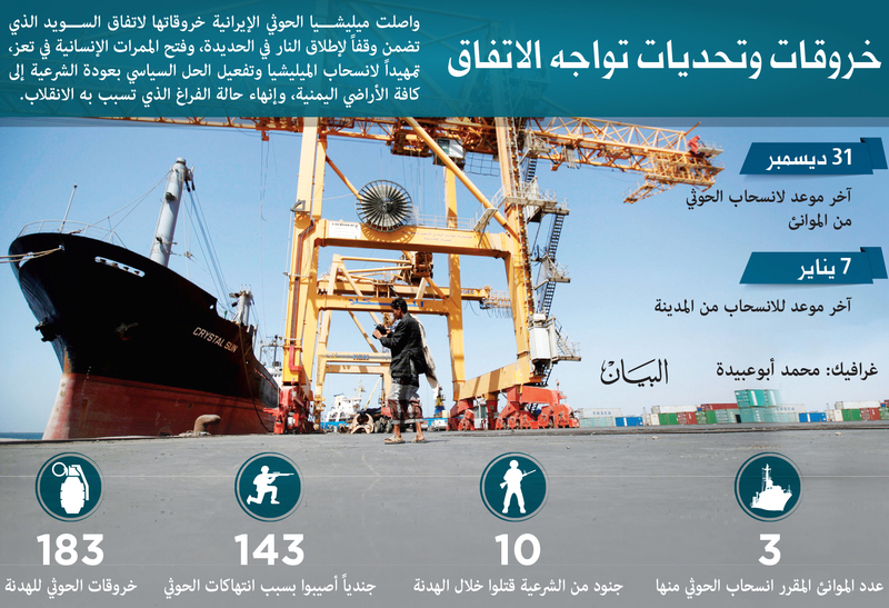 فيما بدأت الميليشيا بإزالة الألغام التي زرعتها استعداداً لمغادرة مواقعها، فيما شككت الشرعية بالتزام الحوثي، حيث صرح وكيل أول محافظة الحديدة، وليد القديمي، لـ«البيان» أن يوم غد (الجمعة) سيكون حاسماً ستتضح فيه نوايا الميليشيا في تنفيذ الاتفاق أو استكمال الانقلاب عليه.