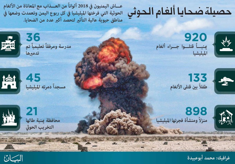 كما تسببت الألغام والعبوات الناسفة بإصابة 10 مدنيين. وذكر المركز أن ميليشيا الحوثي تواصل زرعها عشرات الألغام والعبوات الناسفة التي تنفجر بين حين وآخر في الطرقات والمنازل، وأن هناك المئات منها ما زال مزروعاً في عدة مناطق سكنية وقرى وأرياف منها مديرية مقبنة.