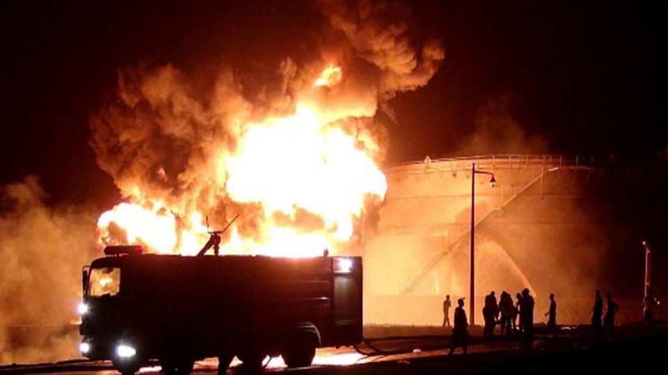كما أشار المراسل إلى وجود تضارب في المعلومات بشأن الأسباب الحقيقة للانفجار، موضحاً أن أسباب حريق أحد خزانات النفط يبدو غير واضح.