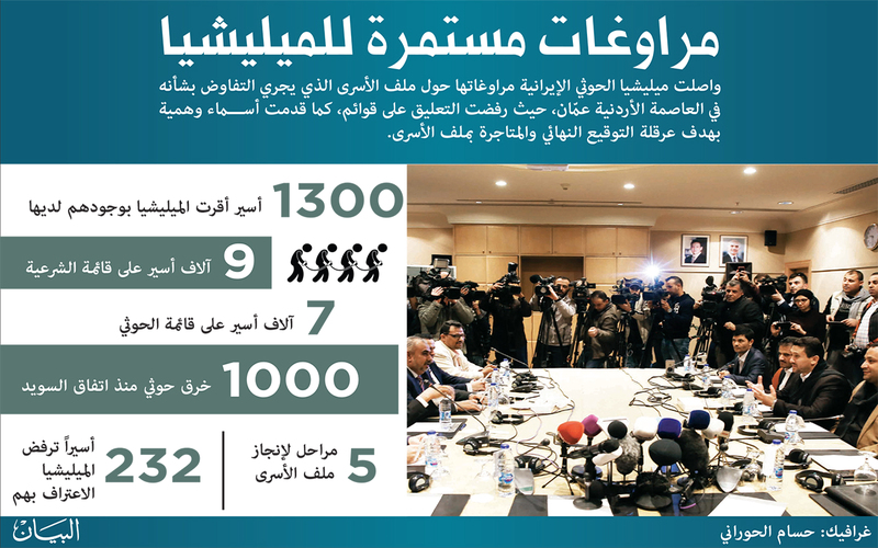 وقال رئيس وفد الشرعية اليمنية في ملف الأسرى والمعتقلين، هادي هيج، لـ«البيان»: إنّ المقترح الحوثي بالاكتفاء في المرحلة الأولى بتبادل نحو 200 معتقل وأسير بين كل جانب هو مقترح مرفوض بتاتاً، وهو مبادرة مخالفة لنص الاتفاقية الأساسية التي تشمل تبادل جميع الأسرى والمعتقلين من الطرفين.