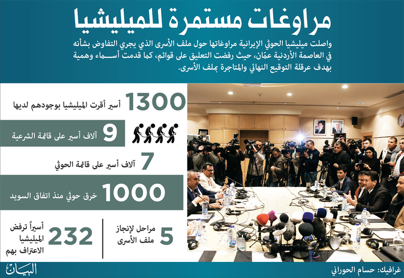 في عمّان، واصلت لليوم الثاني على التوالي، أطراف ممثلة عن الحكومة اليمنية الشرعية، وميليشيا الحوثي، متابعة اتفاق تبادل الأسرى والمعتقلين والمختطفين والمخفيين قسراً، برعاية المبعوث الأممي لليمن مارتن غريفيث ورئيس اللجنة الدولية للصليب الأحمر بيتر مورير.