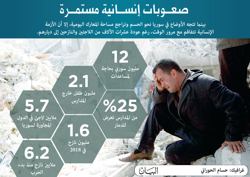 وحول الوضع في إدلب والتصعيد الروسي الأخير من خلال القصف، أشار مصدر لـ«البيان» إلى أن روسيا تتجه لحسم مصير مدينة إدلب، والتخلص من جبهة النصرة من خلال عملية عسكرية، مشيراً إلى أن الجانب التركي لم يتمكن من احتواء الوضع في المدينة.
