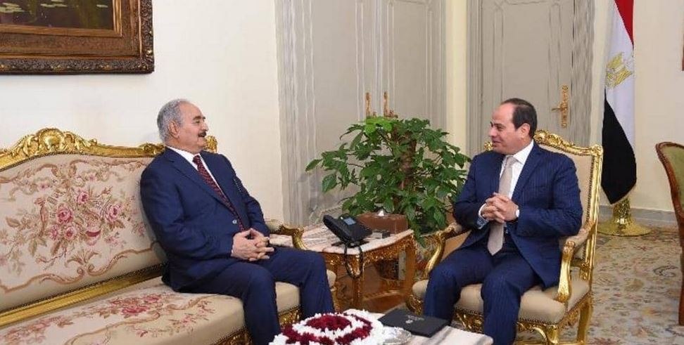 وقال البيان إن السيسي التقى "بقصر الاتحادية المشير خليفة حفتر القائد العام للقوات المسلحة الليبية، حيث تم بحث تطورات ومستجدات الأوضاع على الساحة الليبية".