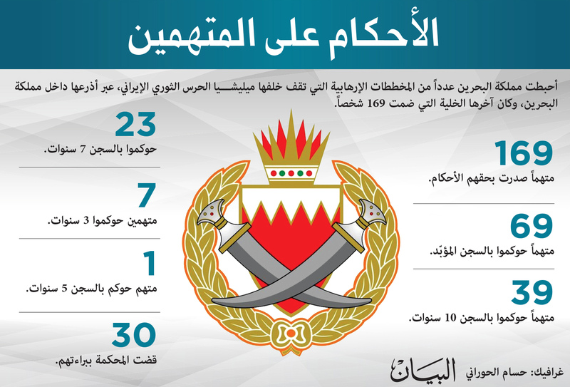 صرح المحامي العام البحريني المستشار الدكتور أحمد الحمادي رئيس نيابة الجرائم الإرهابية بأن المحكمة الكبرى الجنائية الرابعة، في البحرين، أصدرت حكماً، أمس، على 169 متهماً بجناية تأسيس والانضمام إلى جماعة إرهابية وإحداث تفجير والشروع في القتل والتدرب على استعمال الأسلحة والمتفجرات وحيازة وإحراز وصناعة واستعمال المواد المفرقعة والأسلحة النارية بغير ترخيص وتمويل جماعة إرهابية ونقل واستلام وتسليم أموال خصصت لجماعة إرهابية وإخفاء الأسلحة والذخائر والمتفجرات وإتلاف أموال مملوكة لجهة حكومية وللغير بمعاقبة 139 وبراءة 30، حيث حكم على 69 متهماً بالسجن المؤبد، ومعاقبة 39 متهماً بالسجن لمدة عشر سنوات، ومعاقبة 23 متهماً بالسجن لمدة سبع سنوات، ومعاقبة متهم واحد بالسجن لمدة خمس سنوات، ومعاقبة سبعة متهمين بالحبس لمدة ثلاث سنوات، وتغريم 96 متهماً منهم بمبلغ مئة ألف دينار لكل منهم، وأيضاً تغريم 12 متهماً منهم مبلغ 500 دينار لكل منهم، وإلزام أحد المتهمين بمبلغ 2231 ديناراً قيمة التلفيات، كما أمرت بإسقاط الجنسية البحرينية عن138 متهماً وبمصادرة المضبوطات، وقضت ببراءة 30 متهماً.