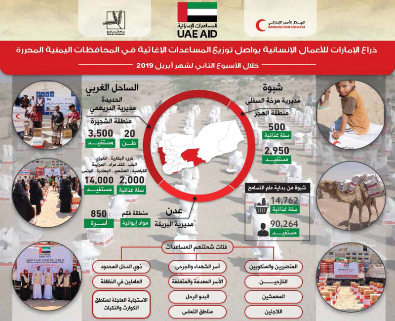 وتفصيلاً فقد وزعت دولة الإمارات ممثلة في هيئة الهلال الأحمر 60 طناً من المساعدات الغذائية بمديرية الدريهمي بمحافظة الحديدة استفاد منها آلاف السكان في مناطق النخيلة والهدة و المبرق و الكتف.. فيما شهدت مديرية مرخة السفلى بمحافظة شبوة توزيع 20 طناً من المساعدات على ذوي الدخل المحدود استفاد منها 2950 فرداً في منطقة الهجر.