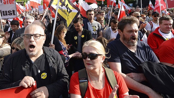 وتظاهر آلاف القوميين في العاصمة البولندية، السبت، احتجاجا على قانون أمريكي بشأن إعادة ممتلكات يهودية صودرت خلال المحرقة النازية، وهي المسألة التي تبرز قبيل انتخابات برلمانية في وقت لاحق هذا العام.