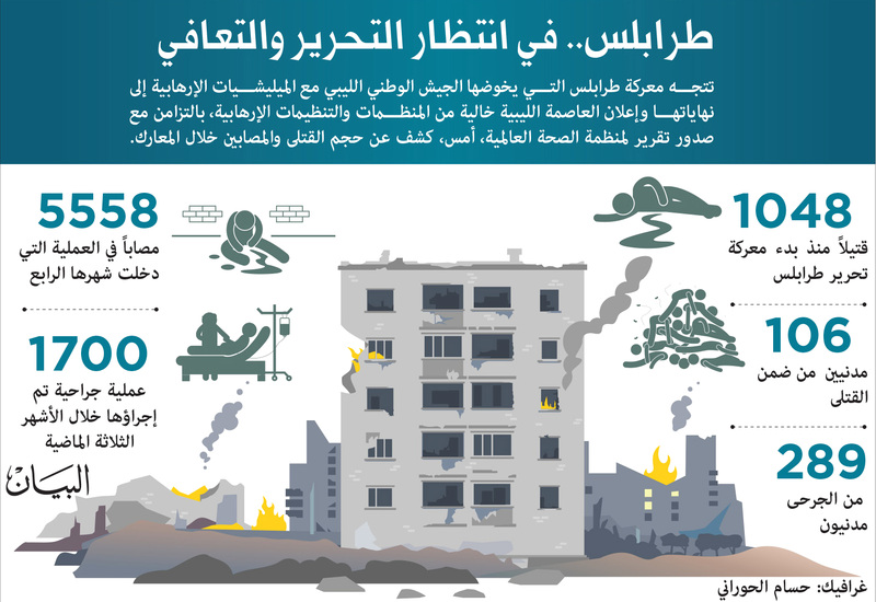 أكمل الجيش الوطني الليبي استعداداته لإطلاق المرحلة الأخيرة من معركة تحرير طرابلس، وكشف عن خطته لاقتحام المدينة التي لاتزال أجزاء منها تحت سيطرة الميليشيات الإرهابية، محذراً في الوقت ذاته تركيا من أن عناصرها الذين يعملون كخبراء مع الميليشيات سيكونون هدفاً مشروعاً لمروحيات الجيش. وأكدت مصادر لـ"البيان" ان الخطة جاهزة وفي انتظار قرار من القائد العام المشير خليفة حفتر.. بالتزامن مع رفض الجيش شروط مصراتة للانسحاب من محاور القتال.