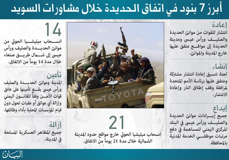 وإذ تأمل المنظمة الدولية التوافق على القضايا الخلافية والذهاب نحو تطبيق شامل للاتفاق استناداً إلى خطة إعادة الانتشار التي قدمتها الأمم المتحدة وصادق عليها ممثلو الشرعية وميليشيا الحوثي، فإن هذه الميليشيا لجأت إلى التصعيد ميدانياً بهدف تحقيق أي اختراق قد يحسن من موقفها التفاوضي، لكن القوات المشتركة تصدت لكل هذه المحاولات، وحالت دون تحقيق أي تقدم للميليشيا، غير أن تصاعد الخروقات وصمت المراقبين الدوليين يهدد بنسف اتفاق استوكهولم.