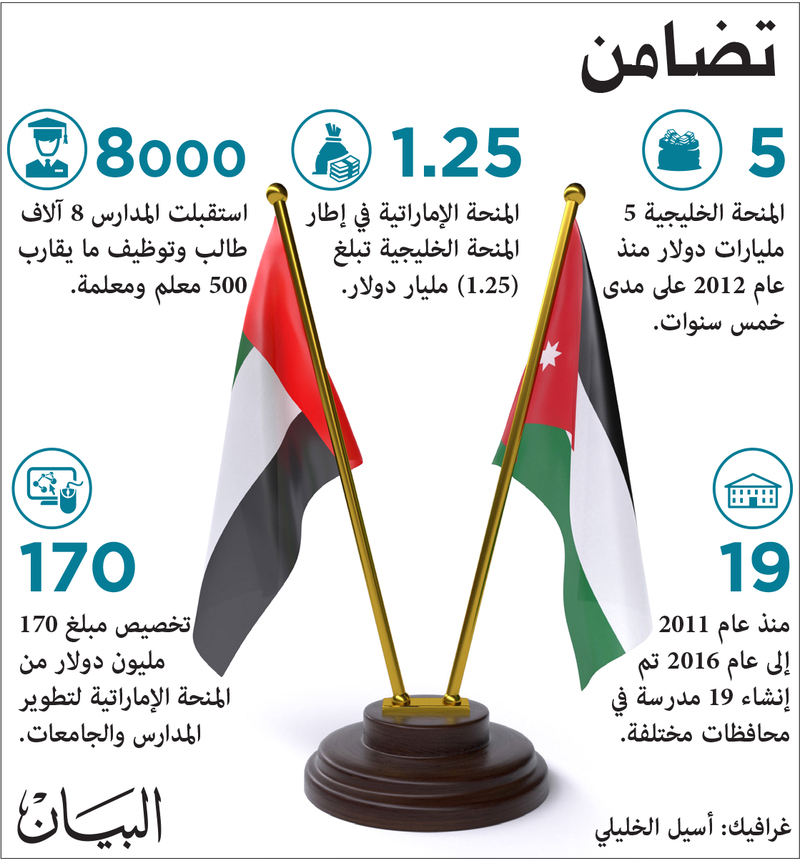 مديرة إدارة التخطيط والبحث التربوي في وزارة التربية والتعليم، د. نجوى قبيلات أكدت أن دولة الإمارات العربية الشقيقة لا تتوانى عن تقديم المساعدة للأردن الذي يواجه أزمة اقتصادية معقدة بسبب اللجوء السوري والعراقي وغيره، وهذا بدوره ضاعف أعداد الطلبة في عمر الدراسة. فأصبح هنالك ضرورة على وزارة التربية والتعليم أن تقوم بإنشاء 60 مدرسة سنوياً لاستقبال هذه الأعداد. والتخلص من المدارس المستأجرة ذات الفترتين علاوة على مواجهة النمو السكاني المتزايد.