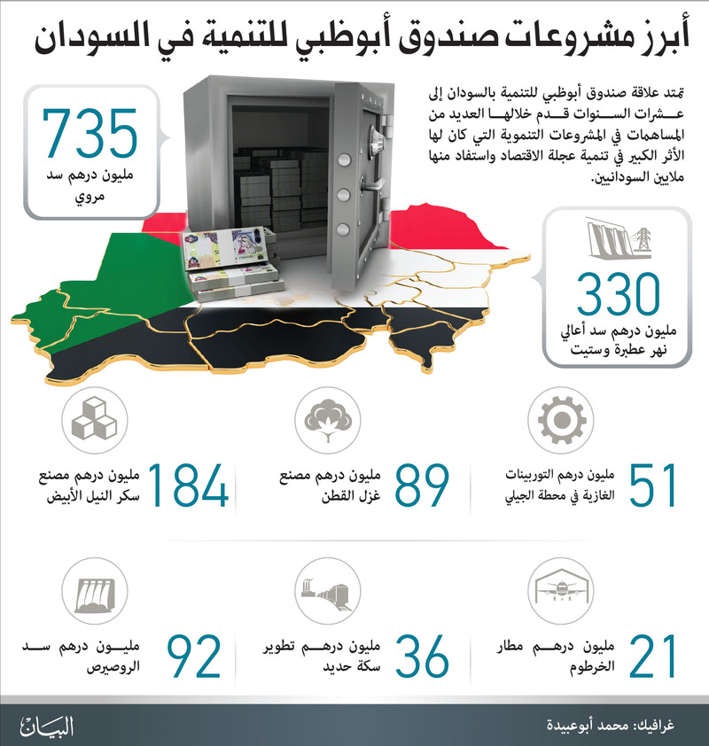 وظل صندوق أبوظبي للتنمية الذي بدأ نشاطه التنموي في السودان منذ عام 1976، واحداً من المؤسسات الإماراتية الداعمة والمُموِلة بشكل مستمر للعديد من مشاريع التنمية في السودان بالقطاعات المختلفة الصناعية والنقل والمياه والري، وبلغ حجم نشاط صندوق أبوظبي للتنمية في السودان 7.3 مليارات درهم، فيما بلغت تمويلات واستثمارات الصندوق 2.3 مليار درهم، إلى جانب ودائع الصندوق التي بلغت 5 مليارات درهم.