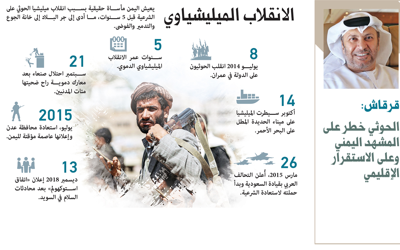 وقال معالي الدكتور أنور قرقاش في تغريدة على «تويتر»: إن «الذكرى الخامسة للانقلاب الحوثي على الدولة والشعب اليمني الشقيق حزينة». وأضاف أن «تقويض بناء الدولة المستندة إلى الحوار اليمني والمعاناة الإنسانية حصيلة هذا الانقلاب».