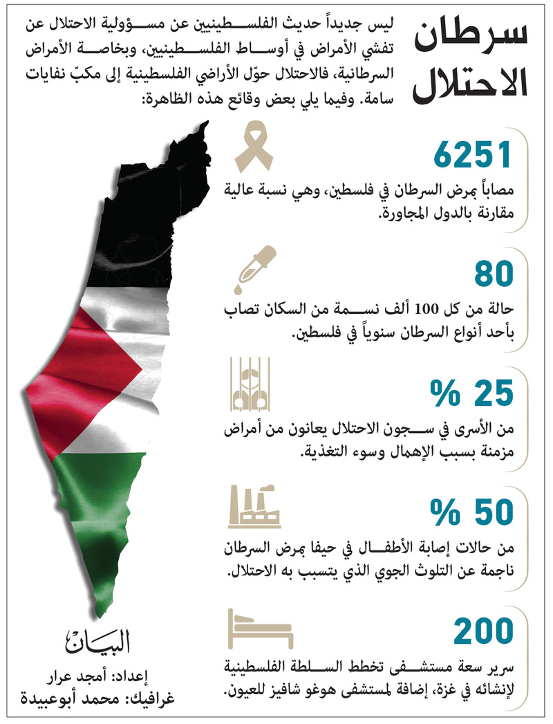 لا يكتفي الاحتلال الإسرائيلي بنهب الأرض الفلسطينية وزراعتها بالمستوطنات، بل ذهب في طغيانه حد زرع الأمراض، وبخاصة السرطانية، في أجساد الفلسطينيين، فيما يتبادل جيش الاحتلال ومستوطنوه الأدوار في تضييق الخناق على تنقّل الفلسطينيين.
