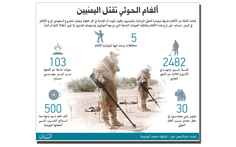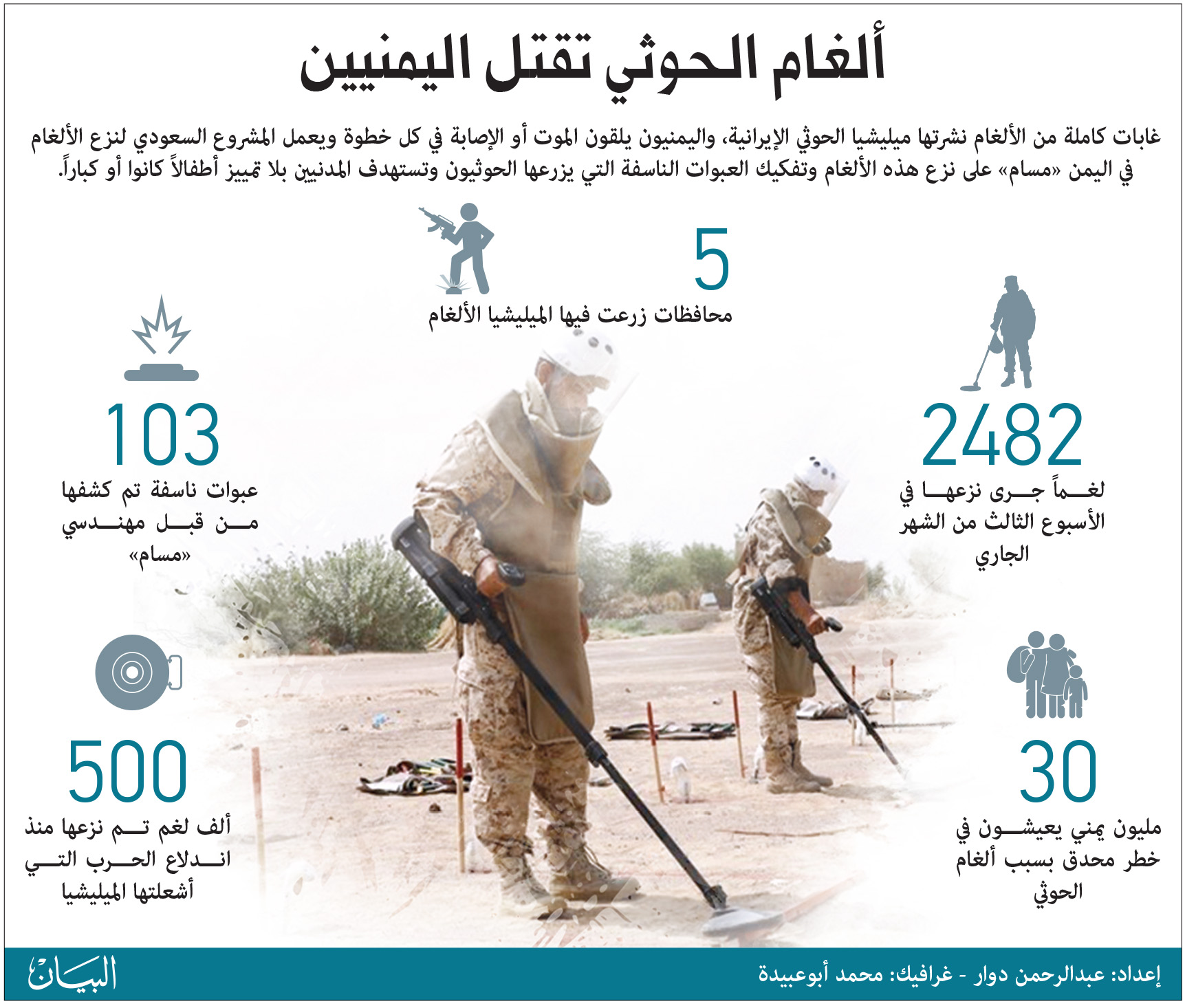 في غضون ذلك، أعلن «مسام»، نزع 5260 لغماً وذخيرةً غير منفجرة من بداية أكتوبر الجاري وحتى 18 منه. وكان تقرير حقوقي، أفاد بأن ميليشيا الحوثي، ومنذ انقلابها في سبتمبر 2014م، اعتمدت استراتيجية ممنهجة في استخدام الألغام والمتفجرات بصنوفها كافة.